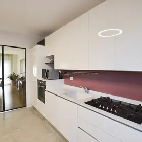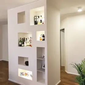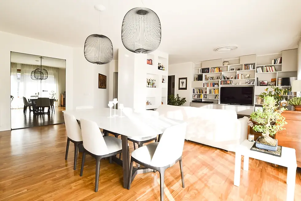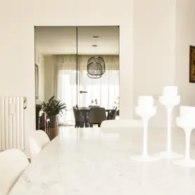 Fusione di due appartamenti in città per ottenere un grande spazio, funzionale per le esigenze di tutti. I materiali prediletti sono, come sempre, il legno, di una tonalità più scura, il bianco, la luce, le tinte pastello per i più piccoli... Alcuni arredi su misura scavati nel cartongesso e retroilluminati offrono a chi abita angoli accoglienti non convenzionali